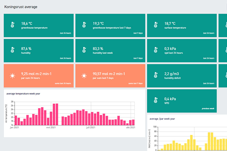 Koningsrust Teeltbegeleiding kan zowel op het teeltbedrijf als op afstand de teelt monitoren. Bijvoorbeeld of de etmaaltemperatuur goed is afgestemd op de lichtsom. Wijken de waardes teveel af van de norm, dan gaat een alarm af.